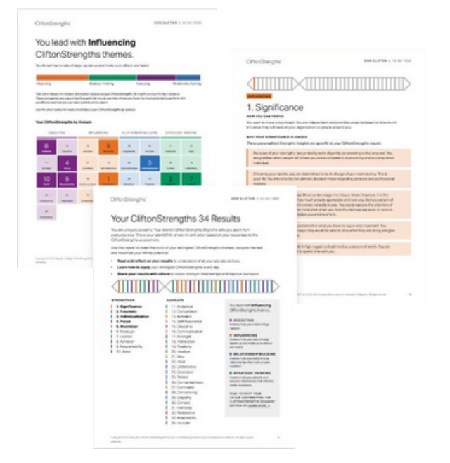 We’ve all wondered who we are and what makes us unique. The Clifton Strengths assessment answers those questions. This online assessment measures the intensity of your talents. They categorize all that’s right with humankind — distilled down to 34 different theme. Immediately after completing the Clifton Strengths assessment, you’ll receive your results in a report featuring customized descriptions of your rank-ordered dominant strengths. When you purchase Clifton Strengths 34 over Top 5, you’ll receive additional reports. Check out the differences here.
